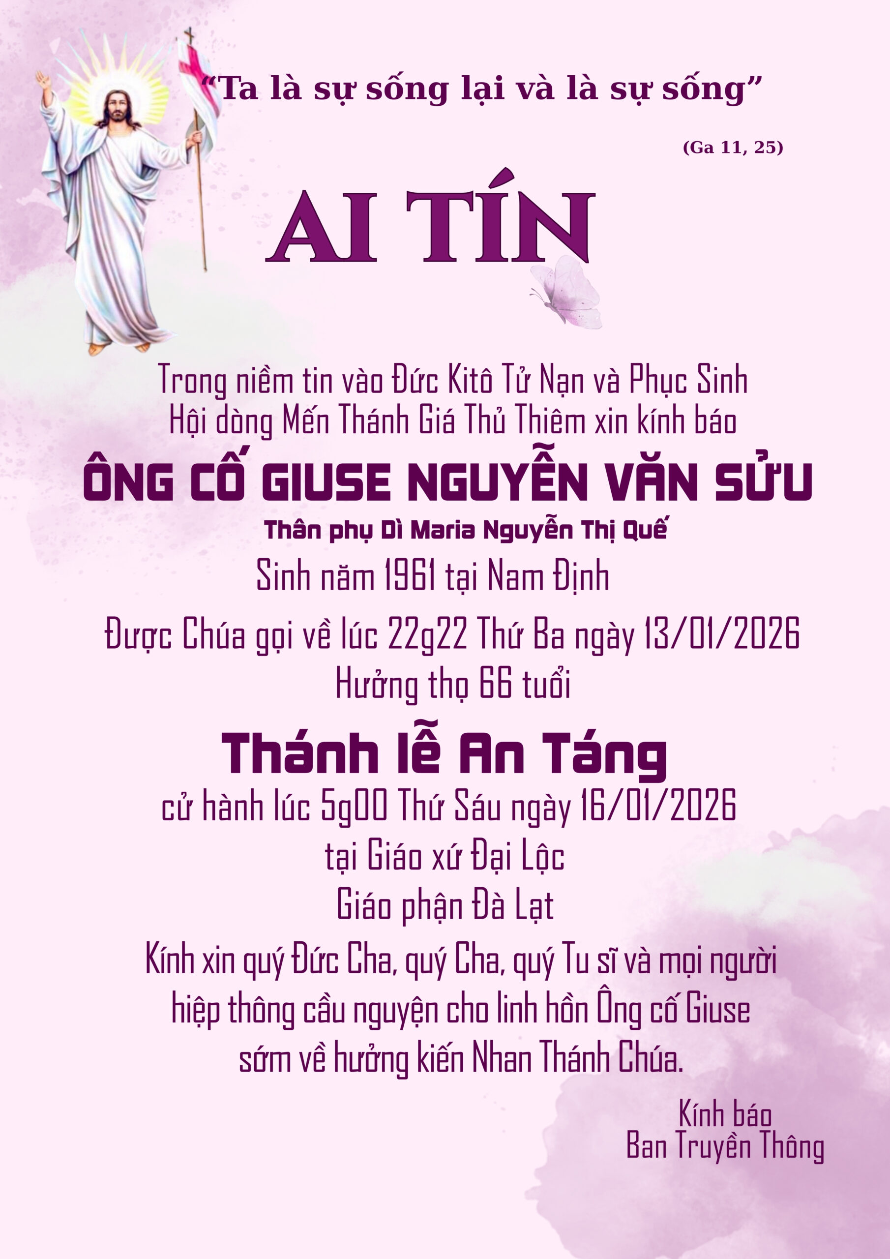 Được Chúa gọi về lúc 22g22 thứ Ba ngày 13/01/2026
